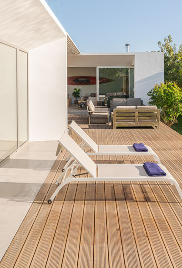 Los suelos para patios presentan requerimientos adicionales relacionados con la gestión del agua: los formatos en losa o tarima permiten la evacuación natural del agua de lluvia entre juntas, evitando el encharcamiento y eliminando la necesidad de sistemas de drenaje adicionales. Para patios al nivel del suelo o con pendientes limitadas, esta característica es un factor crítico de diseño que condiciona la selección del formato y el sistema de instalación.